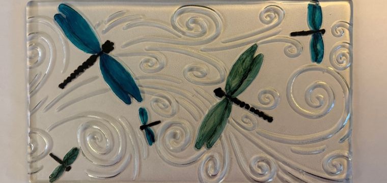 Dragonflies are beneficial to a garden. They are predators that hunt and eat mosquitoes. They zip and dip and hover to find and catch their prey. Some of them are quietly colored while others are vibrant and electric in their coloring. Let your imagination take flight on your own dragonfly glass tile and paint it however you like. No experience necessary and all materials are provided by the artist. You will take home a finished painted fused glass mosaic.