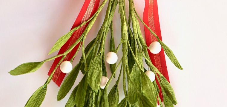 Lets celebrate a wonderful Holiday at the end of this year by making a crepe paper Mistletoe ornament. You will learn how to create a simple bouquet with small green crepe paper leaves, white pearls, glue and wire. Also, we are all going to learn and share about the story behind this amazing North American tradition.